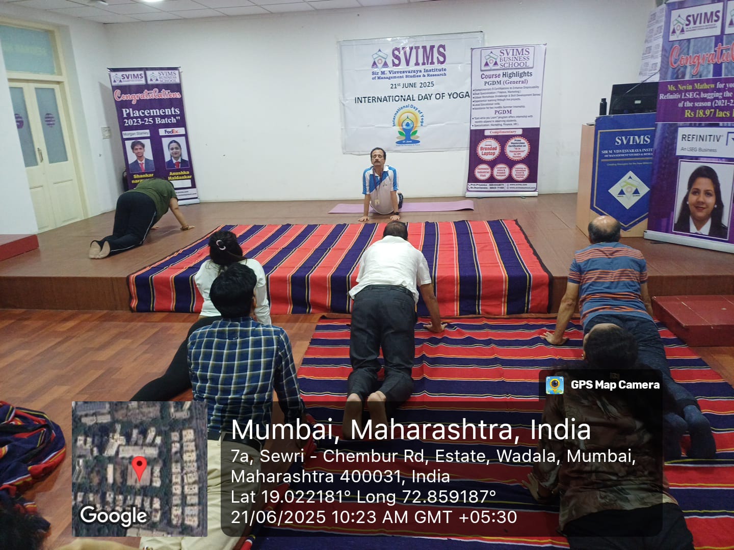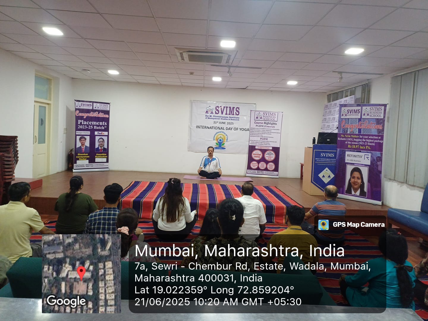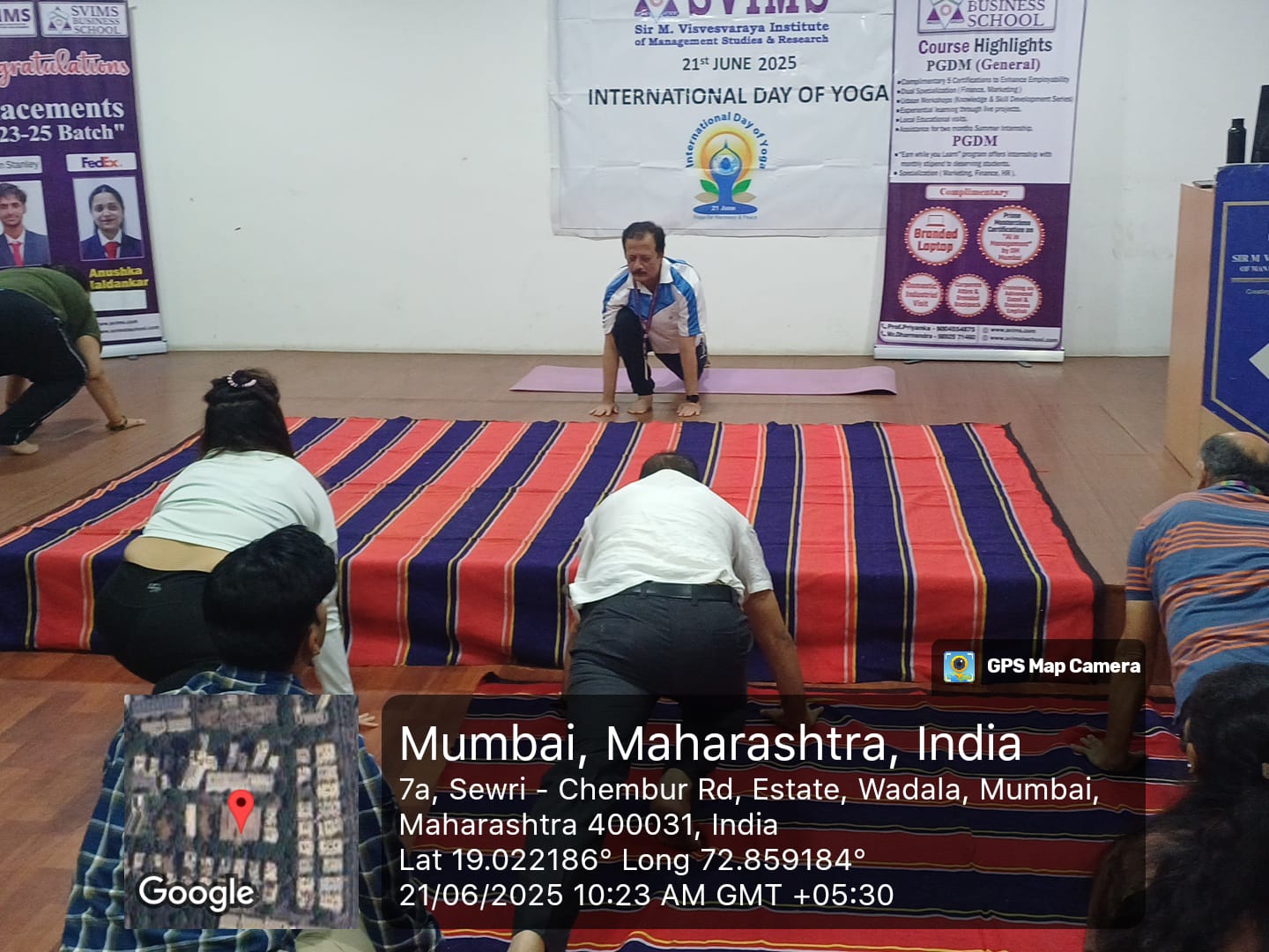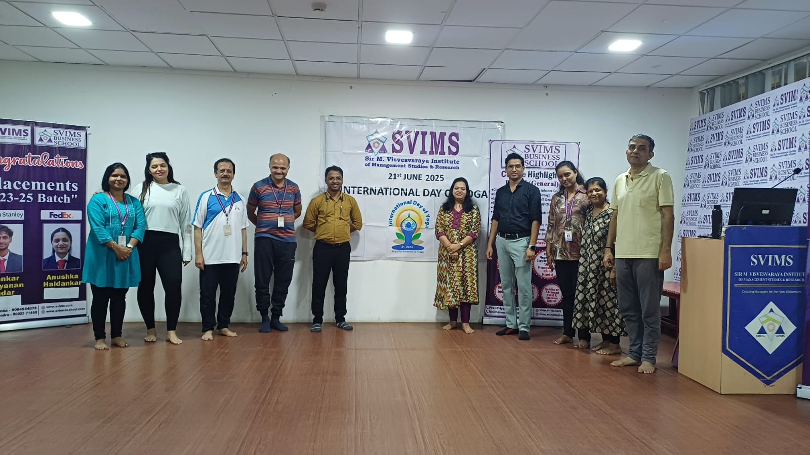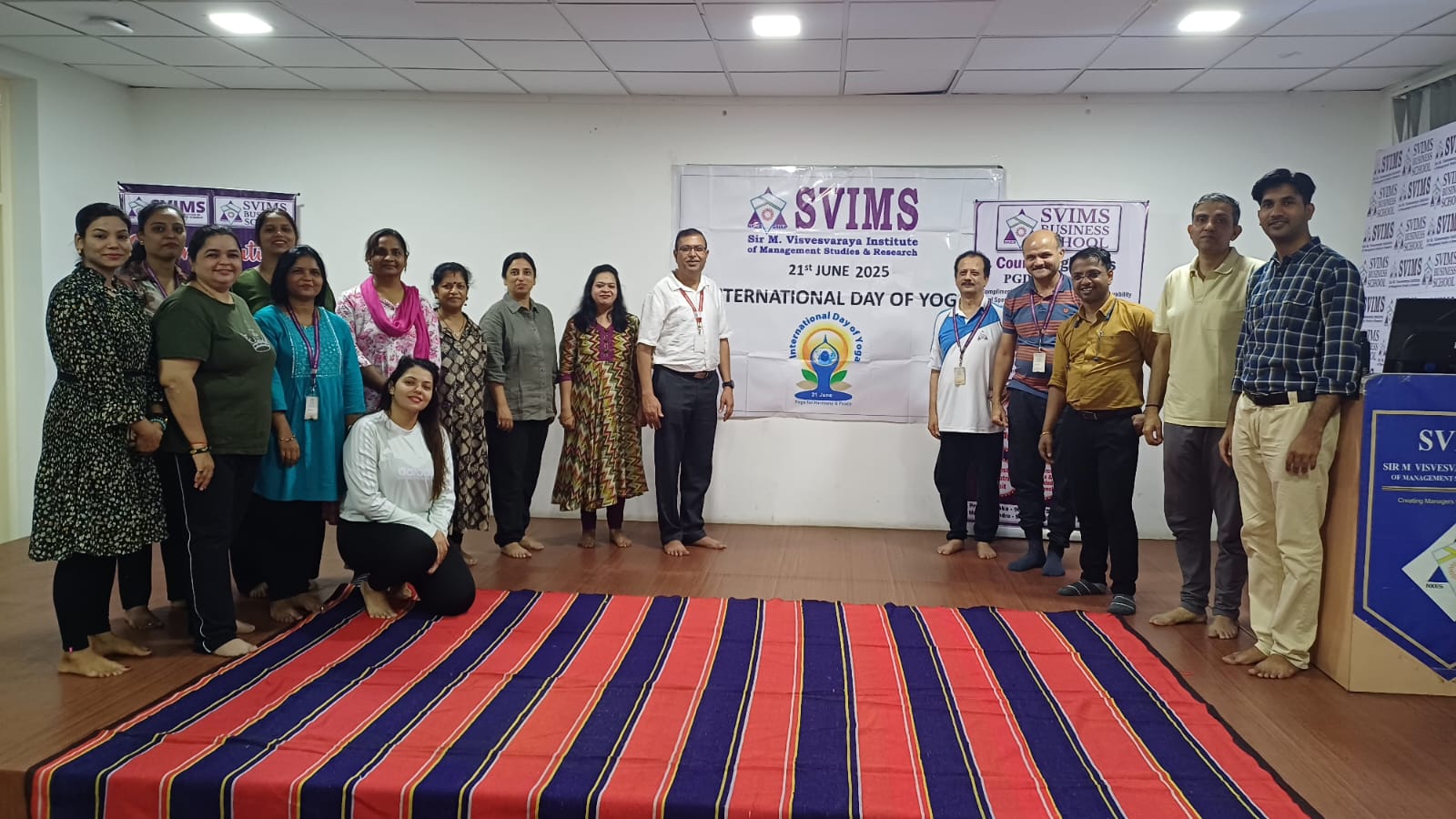 Sir M Visvesvaraya Institute of Management Studies and Research (SVIMS) and SVIMS Business School celebrated International Yoga Day on 21st June 2025 at Seminar Hall from 9.45 am to 10.30 am. Prof. Ganapati Kattige conducted yoga session for present teaching and non-teaching staff members. Tadasan, Vrikshasan, Vajrasan, Bhramari, Anulom Vilom and Surya Namaskar were performed by teaching and non-teaching staff members. Prof. Ganapati Kattige first explained each Asan properly to all present staff. Then all present teaching and non-teaching staff members performed Asanas along with Prof. Ganapati Kattige.